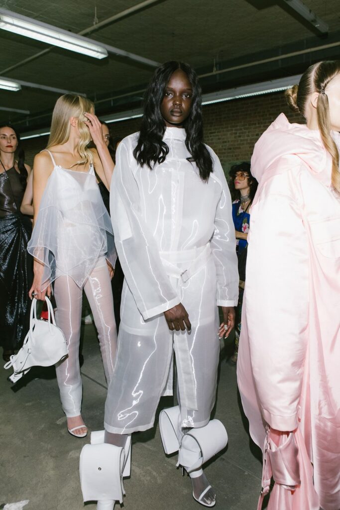 It begins hours before showtime. Models arrive, coffee in hand, dragging suitcases stuffed with essentials. In Lagos, some come straight from casting calls across the city, hair tied up and phones buzzing with directions. Hair and makeup stations are already buzzing brushes, blow dryers, and beauty palettes flying everywhere. A makeup artist hums along to Burna boy as she blends foundation, while another stylist fights humidity with industrial-strength hairspray. The air is electric, a mix of sweat, perfume, and raw energy.